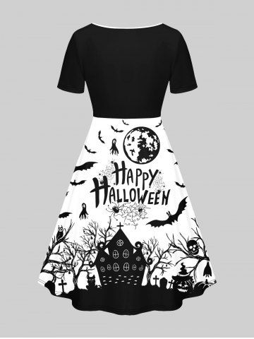 Plus Size Moon Bat Tree Castle Skull Pumpkin Letters Print Halloween Cinched Dress - Black - 4x
