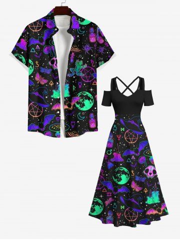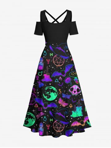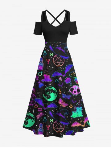 Plus Size Ombre Skull Bat Butterfly Moon Star Galaxy Planet Mushroom Print Halloween Costume Crisscross Maxi Dress - Black - S
