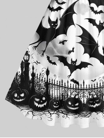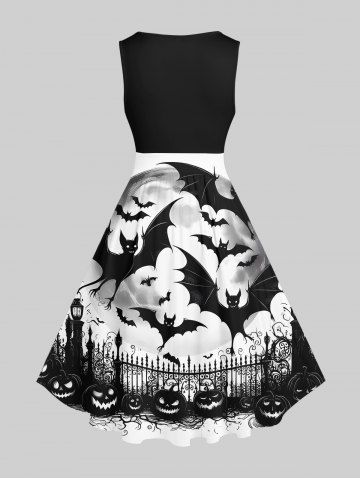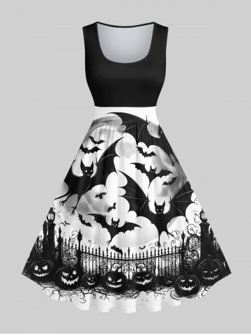 Plus Size Pumpkin Bat Fence Moon Print Halloween Costume Vintage Swing A Line Dress - Black - M