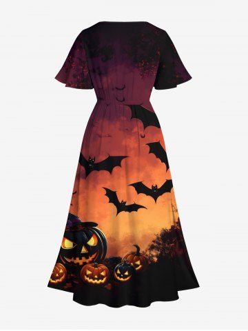 Plus Size Pumpkin Bat Ombre Galaxy Print Halloween Split Pocket A Line Midi Dress - Orange - 2x