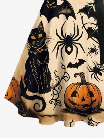 Plus Size Pumpkin Bat Spider Cat Print Halloween Button A Line Dress with Removable Belt - Apricot - 4x