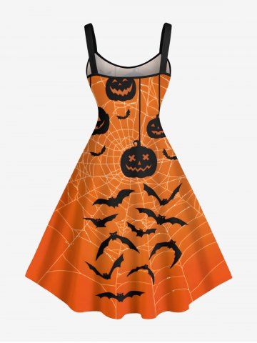 Plus Size Pumpkin Bat Spider Web Print Halloween A Line Tank Dress - Orange - Xs