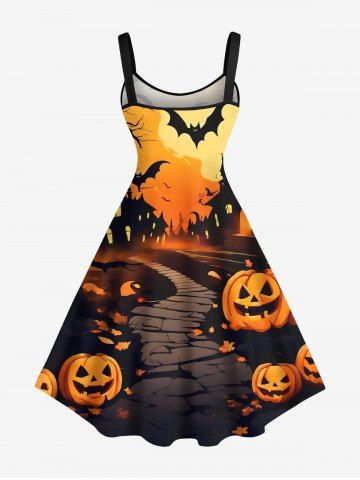 Plus Size Pumpkin Bat Tree Castle Print Halloween A Line Tank Dress - Orange - 1x