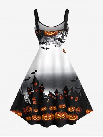 Plus Size Pumpkin Castle Bat Spider Web Ombre Print Halloween A Line Tank Dress - White - 1x