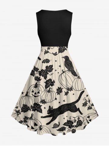 Plus Size Pumpkin Cat Butterfly Leaf Bird Print Halloween 1950s Vintage Swing A Line Dress - Black - Xxs