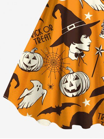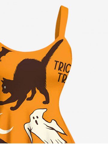 Plus Size Pumpkin Cat Skull Ghost Bat Wizard Spider Web Print Halloween A Line Tank Dress - Orange - M