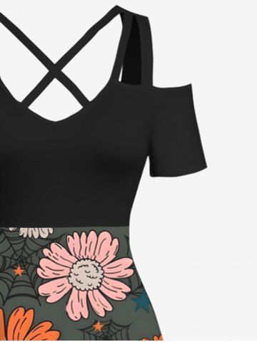 Plus Size Pumpkin Daisy Flower Bat Star Spider Web Print Halloween Costume Crisscross A Line Maxi Dress - Black - Xs