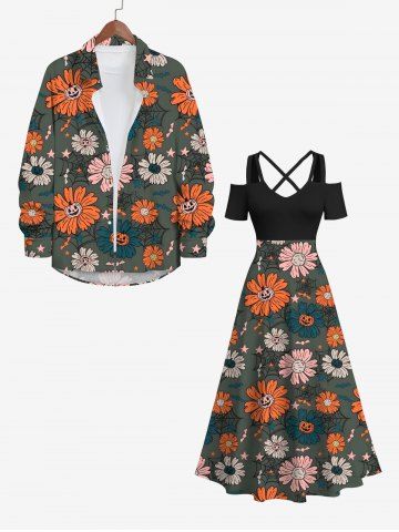 Halloween Dresses > Plus Size Pumpkin Daisy Flower Bat Star Spider Web Print Halloween Costume Crisscross A Line Maxi Dress