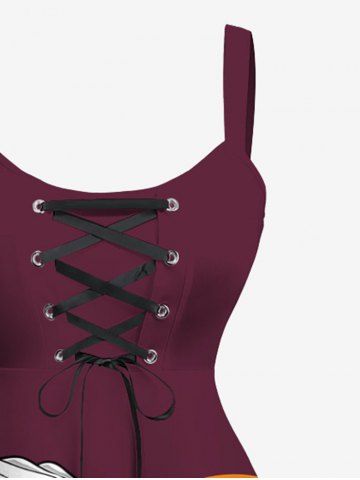 Plus Size Pumpkin Dinosaur Skeleton Moon Bat Tree Print Halloween Lace Up A Line Dress - Red Wine - L