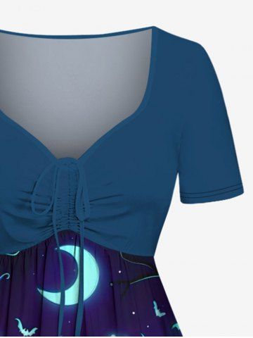 Plus Size Pumpkin Ghost Bat Galaxy Print Halloween Cinched A Line Dress - Deep Green - 4x