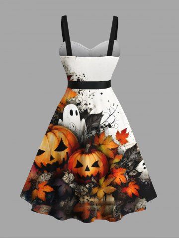 Plus Size Pumpkin Ghost Bat Maple Leaf Print Halloween Button A Line Dress with Removable Belt - White - 2x