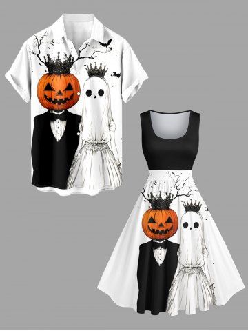 Halloween Dresses > Plus Size Pumpkin Ghost Bride Bridegroom Crown Bat Tree Print Halloween 1950s Vintage Swing A Line Dress