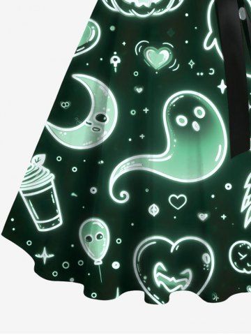 Halloween Dresses > Plus Size Pumpkin Ghost Heart Moon Star Galaxy Print Halloween Ombre Button A Line Dress with Removable Belt