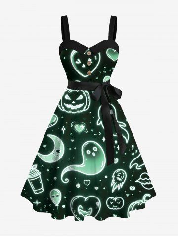 Plus Size Pumpkin Ghost Heart Moon Star Galaxy Print Halloween Ombre Button A Line Dress with Removable Belt - Black - L