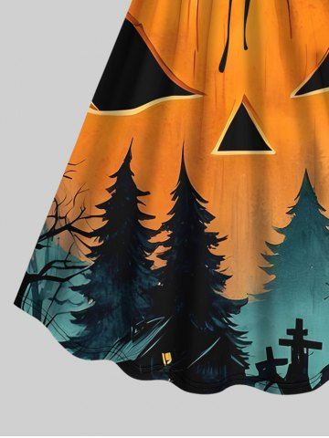 Halloween Dresses > Plus Size Pumpkin Ghost Tree Forest Striped Print Halloween Costume Cinched A Line Dress