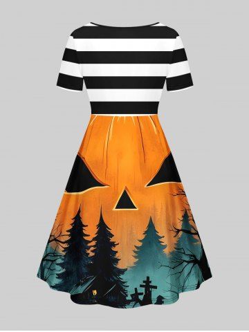 Plus Size Pumpkin Ghost Tree Forest Striped Print Halloween Costume Cinched A Line Dress - Multi-a - L