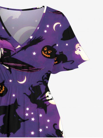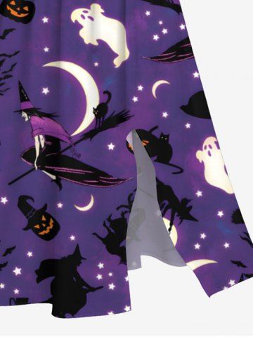 Plus Size Pumpkin Ghost Wizard Moon Star Ombre Galaxy Cat Bat Hat Print Halloween Costume Split Pocket A Line Midi Dress - Purple - Xs