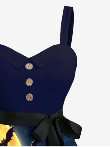 Plus Size Pumpkin Lantern Bat Castle Moon Print Halloween Costume Button A Line Dress with Removable Belt - Black - L