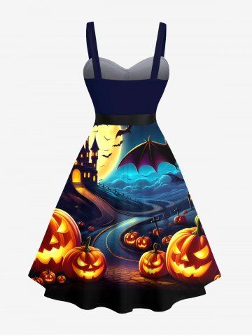 Halloween Dresses > Plus Size Pumpkin Lantern Bat Castle Moon Print Halloween Costume Button A Line Dress with Removable Belt