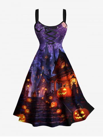Plus Size Pumpkin Lantern Bat Castle Print Halloween Lace Up A Line Tank Dress - Black - 5x