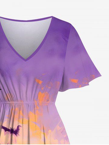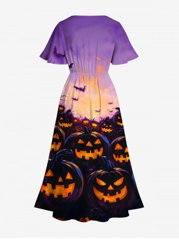 Plus Size Pumpkin Lantern Bat Galaxy Print Halloween Costume Split Pocket A Line Midi Dress - Purple - 5x