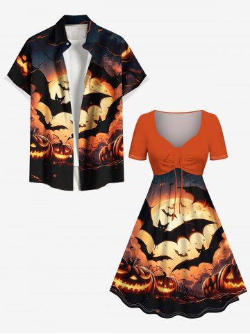 Plus Size Pumpkin Lantern Bat Glitter Moon Print Halloween Cinched A Line Dress - Orange - L