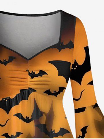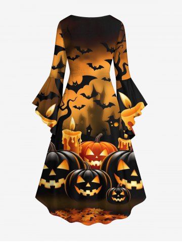 Plus Size Pumpkin Lantern Candle Bat Tree Print Halloween Ruched High Low Asymmetric Dress - Black - 3x