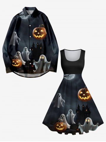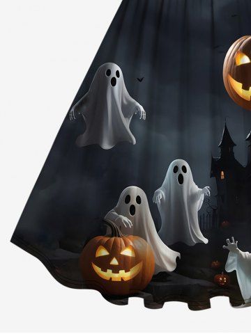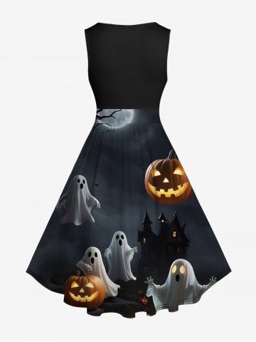 Plus Size Pumpkin Lantern Ghost Moon Tree Castle Midnight Print Halloween Costume Vintage Swing A Line Dress - Black - L
