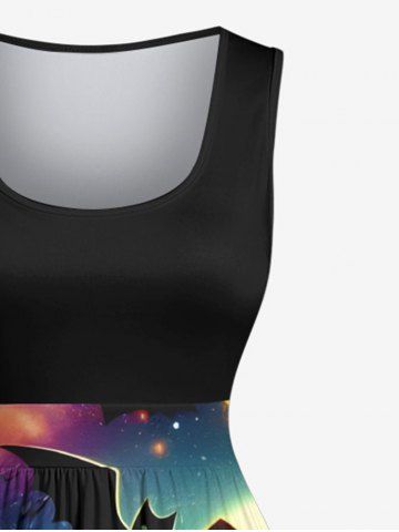 Plus Size Pumpkin Lantern Ghost Tree Bat Moon Ombre Galaxy Print Halloween 50s Vintage Swing A Line Dress - Black - 1x