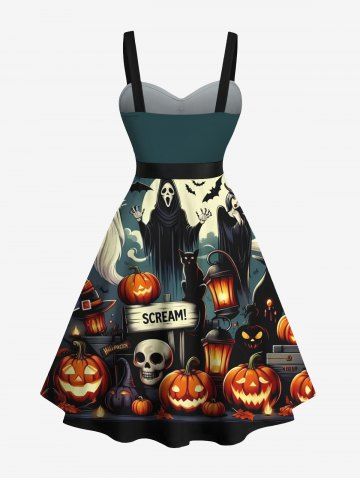 Plus Size Pumpkin Lantern Skull Wizard Ghost Bat Moon Print Halloween Button A Line Dress with Removable Belt - Deep Green - 4x