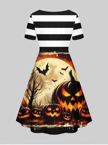 Halloween Dresses > Plus Size Pumpkin Lantern Tree Bat Moon Striped Print Halloween Costume Cinched A Line Dress