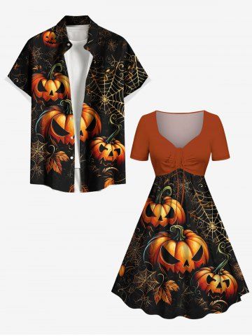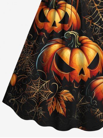 Halloween Dresses > Plus Size Pumpkin Leaf Spider Web Print Halloween Cinched A Line Dress