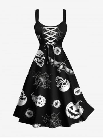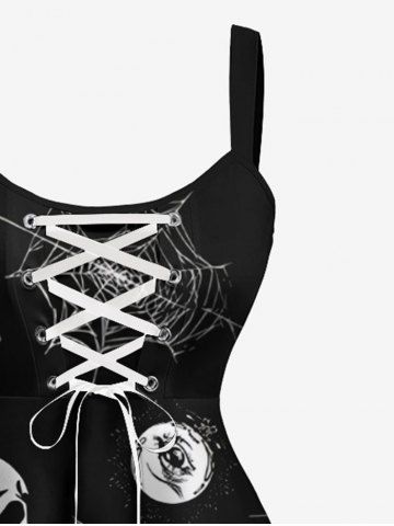 Plus Size Pumpkin Skull Spider Web Bat Print Halloween Lace Up A Line Tank Dress - Black - Xs