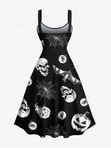 Plus Size Pumpkin Skull Spider Web Bat Print Halloween Lace Up A Line Tank Dress - Black - L