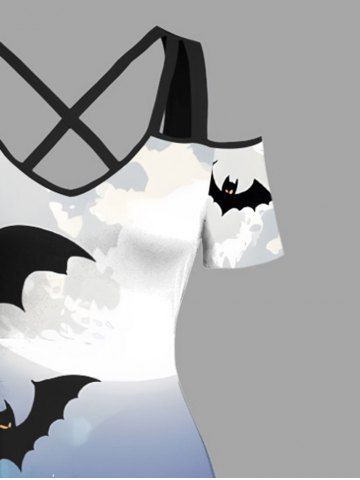 Plus Size Pumpkin Wizard Bat Moon Ombre Galaxy Print Halloween Cold Shoulder Crisscross A Line Maxi Dress - Sky Blue - S