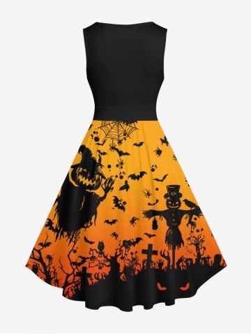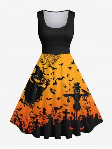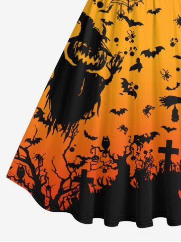 Plus Size Pumpkin Wizard Cross Bat Spider Web Print Halloween Costume Vintage Swing A Line Dress - Dark Orange - 3x