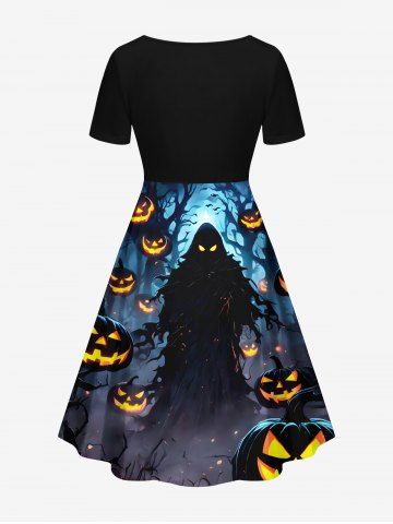 Plus Size Pumpkin Wizard Tree Midnight Print Halloween Costume Cinched A Line Dress - Black - S