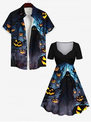 Plus Size Pumpkin Wizard Tree Midnight Print Halloween Costume Cinched A Line Dress - Black - 3x