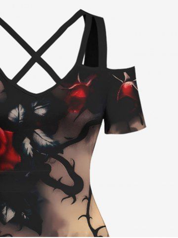 Halloween Dresses > Plus Size Rose Flower Bat Dark Style Print Halloween Cold Shoulder Crisscross A Line Maxi Dress