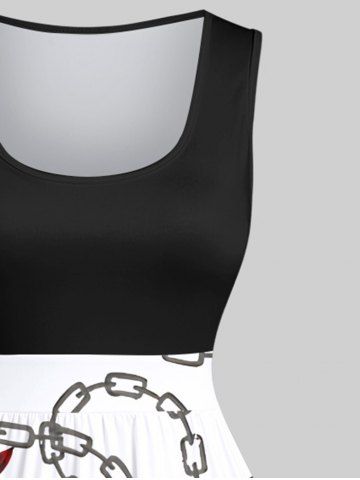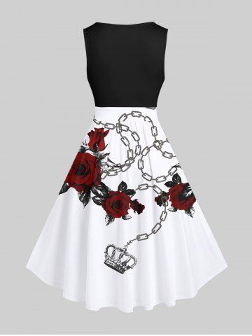 Plus Size Rose Flower Leaf Chain Crown Print Halloween Costume Vintage Swing A Line Dress