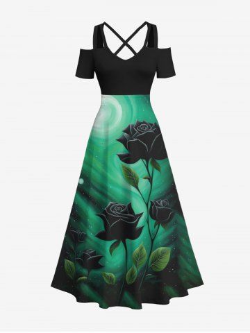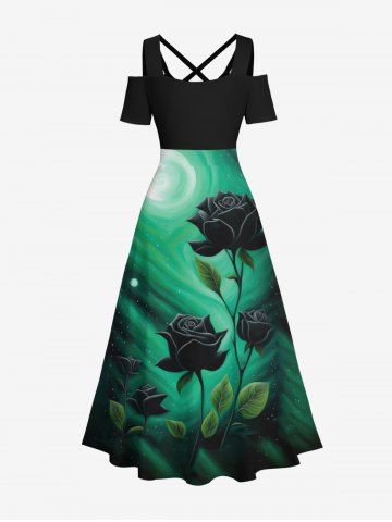 Halloween Dresses > Plus Size Rose Flower Leaf Glitter Painting Galaxy Moon Print Halloween Costume Crisscross A Line Maxi Dress