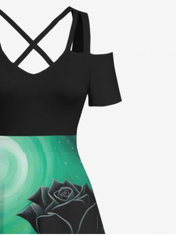 Plus Size Rose Flower Leaf Glitter Painting Galaxy Moon Print Halloween Costume Crisscross A Line Maxi Dress - Black - 5x