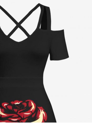 Plus Size Skeleton Hand Rose Flower Leaf Print Halloween Costume Crisscross A Line Maxi Dress - Black - Xs
