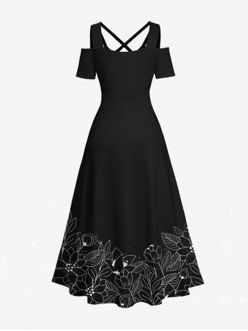 Plus Size Skeleton Hand Rose Flower Leaf Print Halloween Costume Crisscross A Line Maxi Dress - Black - M
