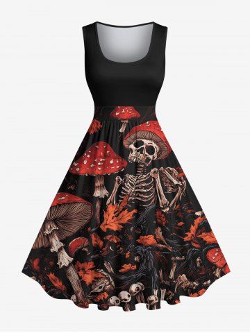 Plus Size Skeleton Mushroom Maple Leaf Print Halloween 1950s Vintage Swing A Line Dress - Black - S