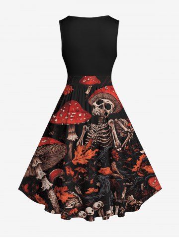 Plus Size Skeleton Mushroom Maple Leaf Print Halloween 1950s Vintage Swing A Line Dress - Black - 5x