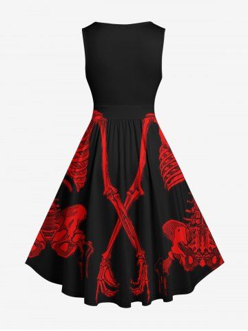 Plus Size Skeleton Print Halloween Costume Vintage Swing A Line Dress - Black - 5x