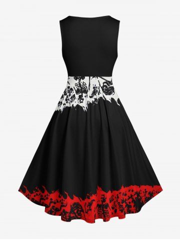 Plus Size Skeleton Spider Fire Flame Print Halloween Costume Vintage Swing A Line Dress - Black - S