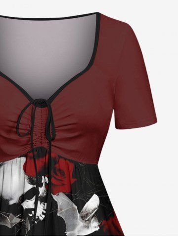 Plus Size Skull Bat Rose Flower Print Halloween Cinched A Line Dress - Red - 4x