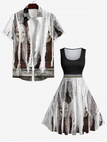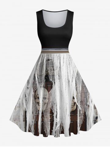 Plus Size Skull Distressed Gauze Print Halloween Costume Vintage Swing A Line Dress - Black - 5x